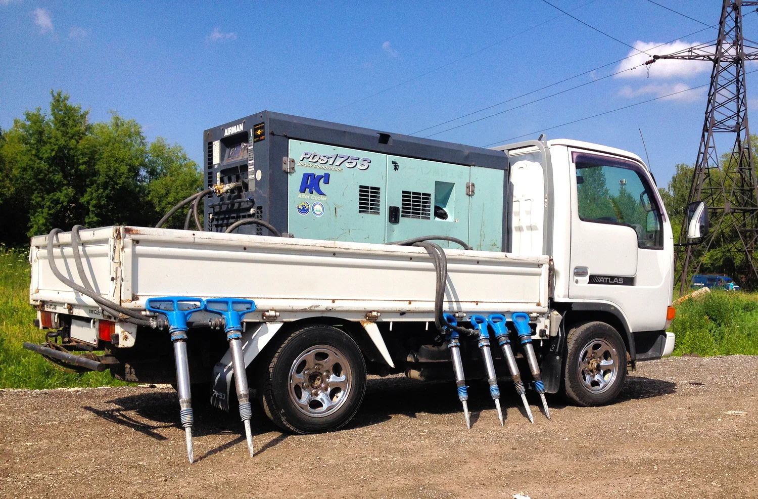 К вам приезжает автомобиль с установленным в кузове компрессором, машинист в течении всего рабочего времени обслуживает компрессор, решает вопросы с отбойными молотками (они входят в комплект), при необходимости переезжает с места на место.